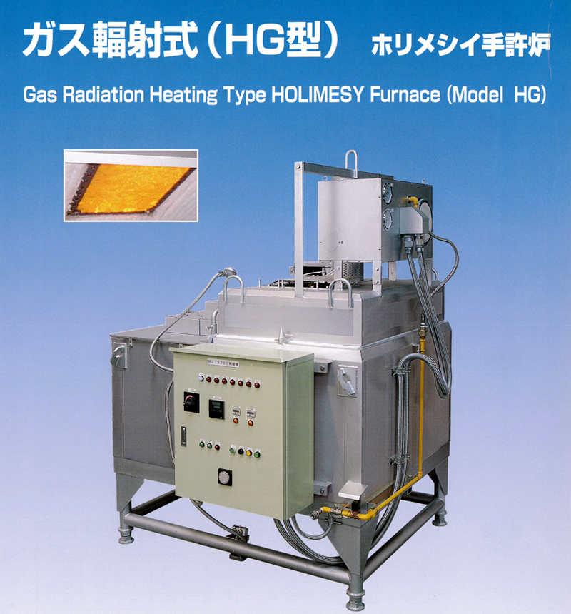 lmmersion tubeless Gas Radiation Heating Type Holimesy Furnace in which the benefits of the conventional Electric Radiation Heating Type Holimesy Furnace have been maximized. The heating device of the conventional Electric Radiation Heating Type Holimesy Furnace was replaced with a surface gas burner, which has successfully reduced the quantity of oxides produced to approximately one-fifth of that obtained with the conventional furnace. This reduction will reduce the frequency of furnace cleaning to once monthly. Accordingly, this is a new version of Holimesy Furnace and will substantially contribute to labor saving.